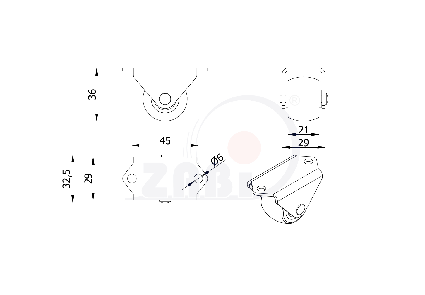 Колёса аппаратные (мебельные), Колёса аппаратные (мебельные), С неповоротными опорами с обозначением S30T